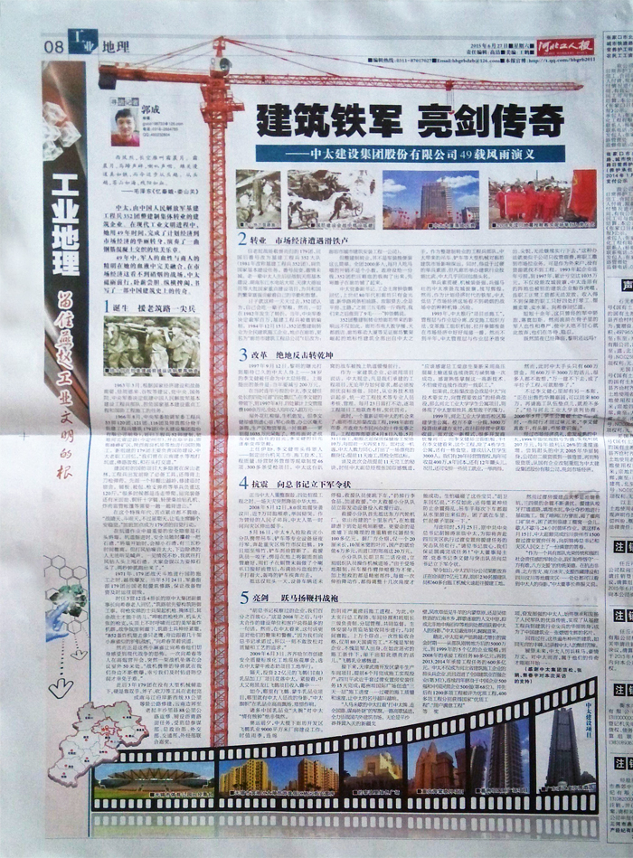 中太,由中國(guó)人民解放軍基建工程兵352團(tuán)整建制集體轉(zhuǎn)業(yè)的建筑企業(yè)。在現(xiàn)代工業(yè)文明進(jìn)程中,她用49年時(shí)間,完成了計(jì)劃經(jīng)濟(jì)到市場(chǎng)經(jīng)濟(jì)的華麗轉(zhuǎn)身,演奏了一曲鋼筋混凝土交織的炫美樂章。