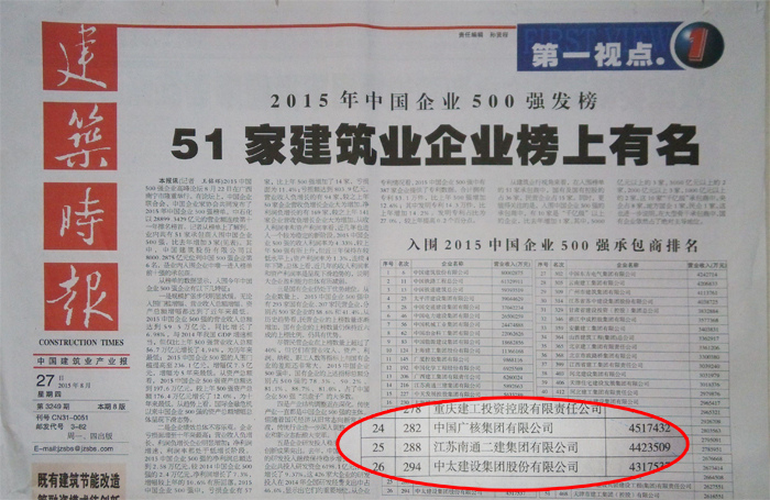 建筑時(shí)報(bào)8月27日?qǐng)?bào)道了中太建設(shè)集團(tuán)入圍2015年中國(guó)企業(yè)500強(qiáng),在入圍的建筑承包商中排名第26位