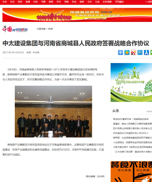 中國網(wǎng)報道了“中太建設集團與河南省商城縣人民政府簽署戰(zhàn)略合作協(xié)議”