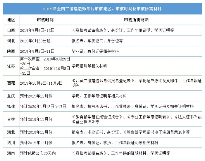 二建考試到現(xiàn)在已過了五月,大部分省市都已公布成績(jī)及合格標(biāo)準(zhǔn)。2019年有不少省市二建是有要求考后審核的。除了江西,其他地方怎么規(guī)定呢?以下是整理的二級(jí)建造師考后審核的地區(qū)及資料,供大家參考,希望對(duì)考生們有所幫助!(詳細(xì)信息以官方文件為主)