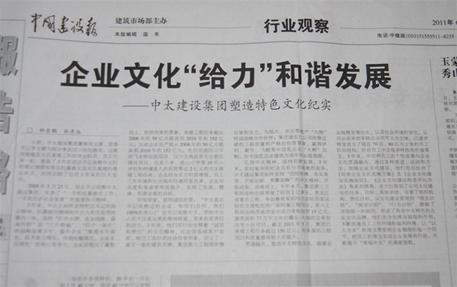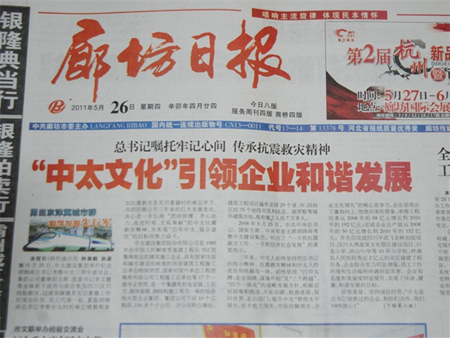 近日,中國(guó)建設(shè)報(bào)、文匯網(wǎng)、河北經(jīng)濟(jì)日?qǐng)?bào)、長(zhǎng)城網(wǎng)、廊坊日?qǐng)?bào)等多家媒體對(duì)公司三年來(lái)銘記胡錦濤總書(shū)記視察中太囑托、弘揚(yáng)抗震救精神,創(chuàng)新發(fā)展,銳意進(jìn)取所取得的豐碩成果進(jìn)行集中報(bào)道,擴(kuò)大了企業(yè)知名度,提升了中太品牌的社會(huì)影響力。