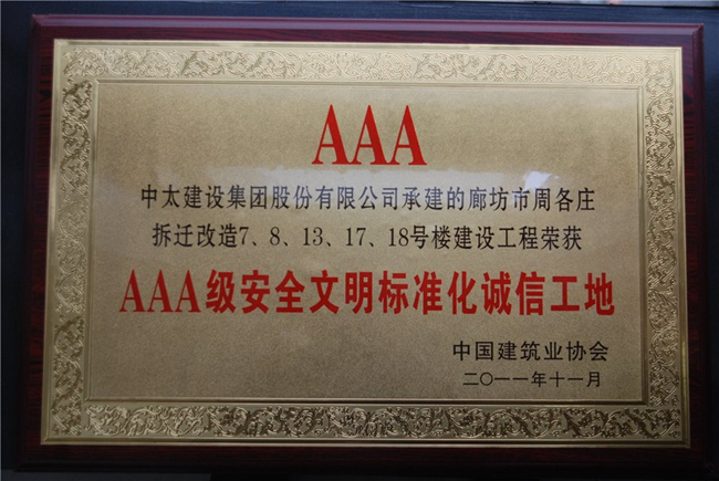 近日,中國建筑業(yè)協(xié)會發(fā)布2011年全國 AAA級安全文明標(biāo)準(zhǔn)化誠信工地評定名單,中太建設(shè)集團(tuán)承建的廊坊市周各莊拆遷改造7、8、13、17、18號樓建設(shè)工程獲評2011年全國 AAA級安全文明標(biāo)準(zhǔn)化誠信工地。