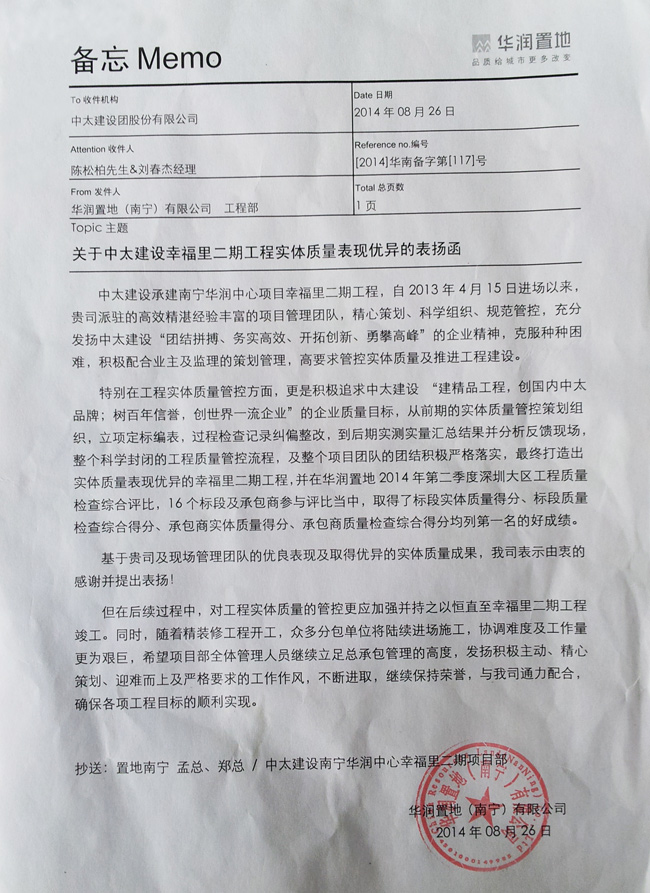 信函提到,自工程項目開工以來,集團公司派駐了高效精湛、經驗豐富的項目管理團隊,積極配合業主及監理的策劃管理,高要求管控實體質量及推進工程建設,打造出實體質量表現優異的幸福里二期工程,并在華潤置地2014年第二季度深圳大區工程質量檢查綜合評比、16個標段及承包商參與評比中,取得了標段實體質量得分、標段質量監察綜合得分、承包商實體質量得分、承包商質量檢查綜合得分均位列第一名的好成績。
