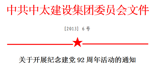 為慶祝中國共產(chǎn)黨建黨92周年,弘揚(yáng)黨的光榮傳統(tǒng)和優(yōu)良作風(fēng),進(jìn)一步調(diào)動(dòng)和激勵(lì)廣大黨員“關(guān)心中太、維護(hù)中太、效力中太”工作的熱情,開創(chuàng)各項(xiàng)工作創(chuàng)新驅(qū)動(dòng)和科學(xué)發(fā)展的新局面,為完成2013年各項(xiàng)工作任務(wù)和經(jīng)濟(jì)技術(shù)指標(biāo)鼓勁加油,推動(dòng)集團(tuán)公司又好又快發(fā)展,深入貫徹黨的“十八大”精神和習(xí)近平同志關(guān)于在全黨進(jìn)一步“轉(zhuǎn)變作風(fēng)、端正學(xué)風(fēng)、改進(jìn)文風(fēng)”的要求,結(jié)合集團(tuán)公司實(shí)際,集團(tuán)黨委決定,在“七·一”前后,開展以下系列活動(dòng):