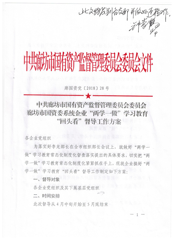 [2018]5號(hào)關(guān)于轉(zhuǎn)發(fā)《廊坊市國(guó)資委系統(tǒng)企業(yè)“兩學(xué)一做”學(xué)習(xí)教育“回頭看”督導(dǎo)工作方案》的通知