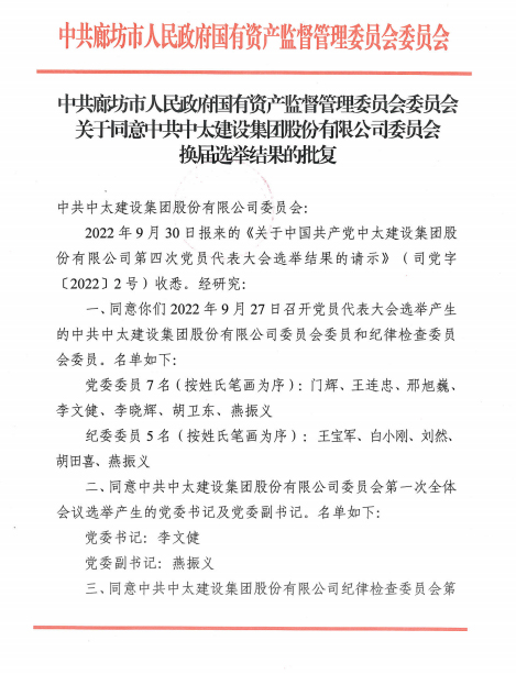 現將《中共廊坊市國有資產監督管理委員會委員會關于同意中共中太建設集團股份有限公司委員會換屆選舉結果的批復》轉發給你們,請及時傳達至全體黨員。